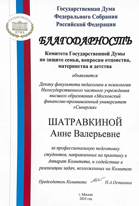 Декан факультета педагогики и психологии Университета «Синергия» Анна Шатравкина получила благодарность Комитета Государственной Думы по защите семьи, вопросам отцовства, материнства и детства за профессиональную подготовку студентов, направленных на практику в Аппарат Комитета, и содействие в реализации задач, возложенных на Комитет.