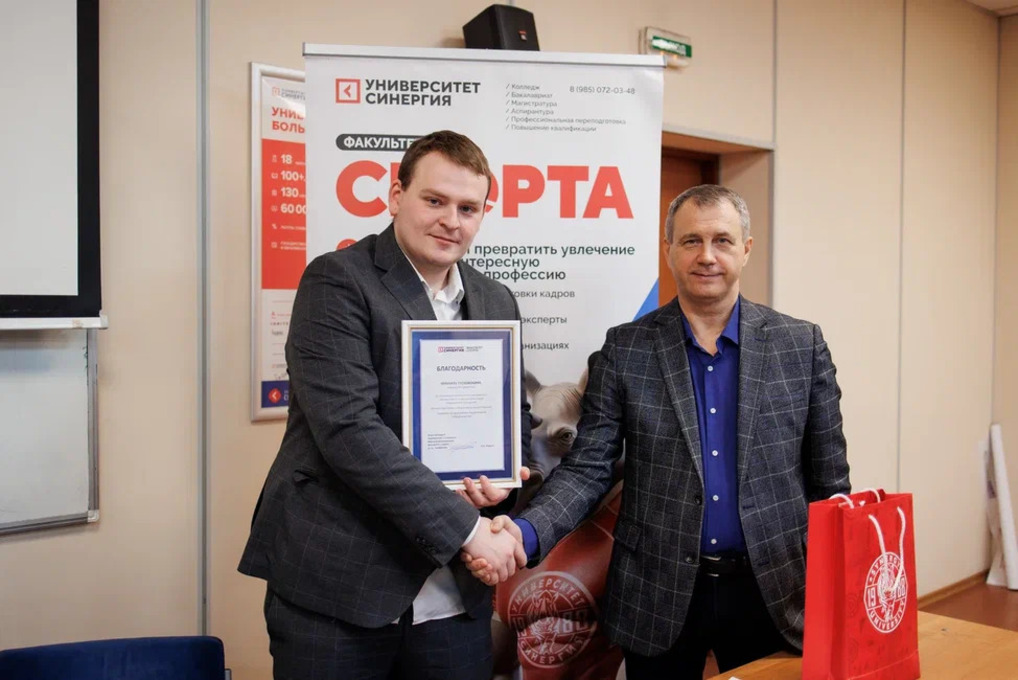 На факультете спорта Университета «Синергия» состоялся традиционный мастер-класс, приуроченный к Всероссийскому дню хоккея. Главный тренер ХК «Дмитров», выпускник факультета спорта Михаил Грозовский рассказал, как совмещать любимый вид спорта с получением образования и построением карьеры, а также о секретах успеха тренерской профессии.