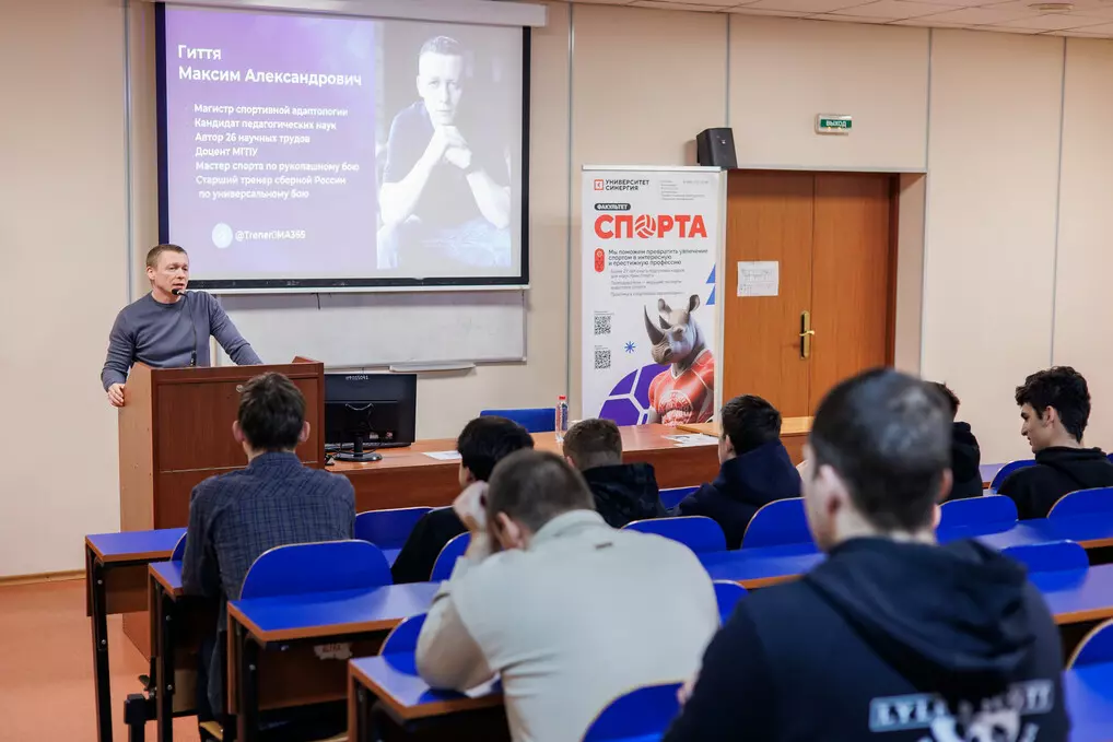 На факультете спорта Университета «Синергия» состоялся мастер-класс на тему «Состояние победителя. Как с помощью физической и психологической подготовки достигать целей». Спикером выступил к.пед.н., мастер спорта по рукопашному бою, старший тренер сборной России по универсальному бою Максим Гиття.