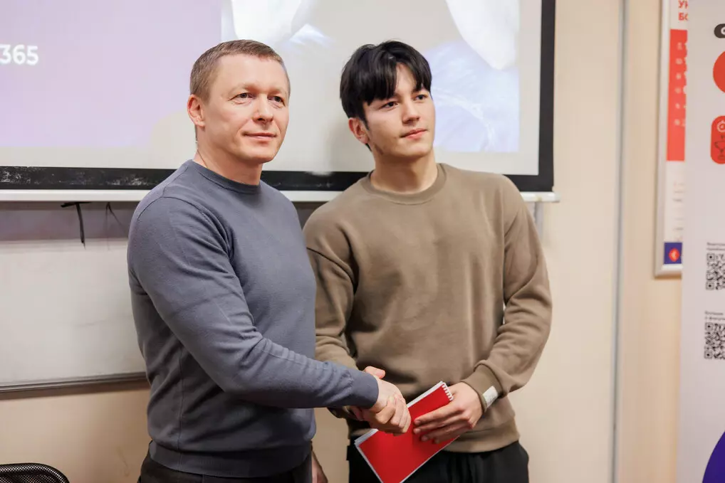 Студенту, который задал самый интересный вопрос спикеру, Максим вручил приз — брендированный блокнот от Университета. Победителем стал первокурсник профиля «Физическая культура» Эрадж Касымов.