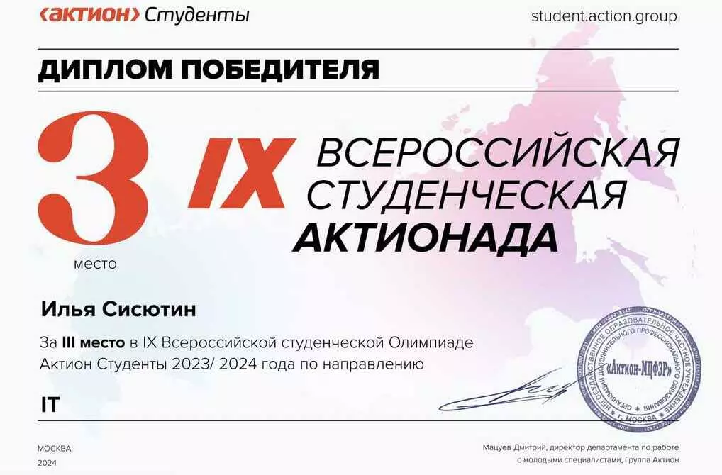 Студент «Синергии» Илья Сисютин соревнуясь с 3753 участниками «Актионады», успешно прошел все этапы и вошел в тройку победителей 2024 года. Тренером-наставником победителя выступил преподаватель кафедры ИМИКТ им. Дика, Сергей Селиверстов. Общий призовой фонд «Актионады» для студентов-победителей и их наставников в 2024 году составил более 1 000 000 рублей.