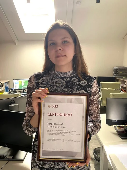 Студентка факультета умных городов Университета «Синергия» Мария Петропольская получила диплом за участие в XX российско-китайской социологической конференции СПБГУ «Современная система образования в России и Китае».