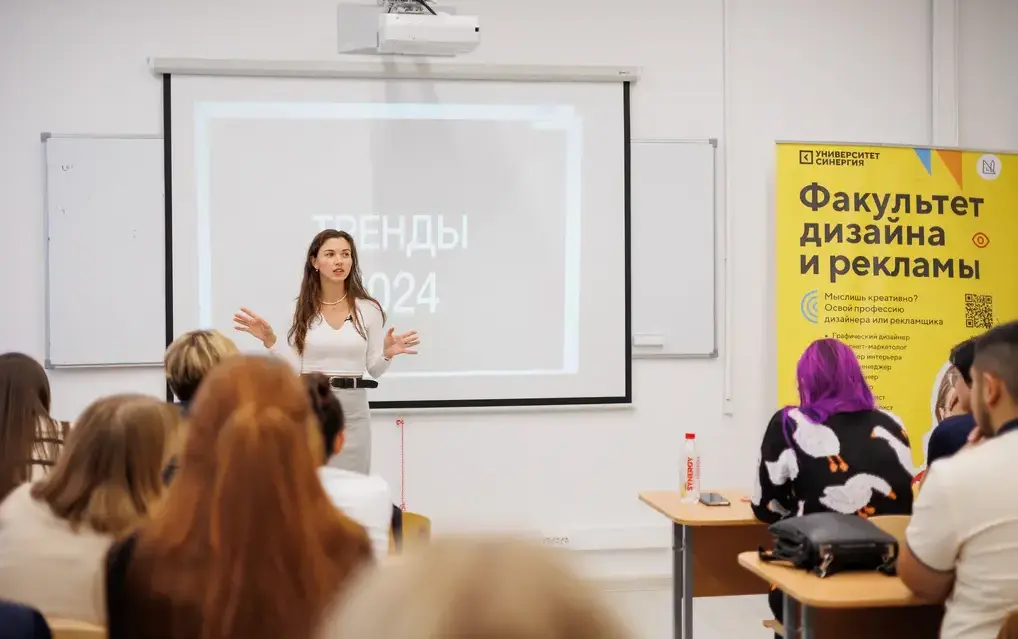 Занятие началось с выступления преподавателя факультета дизайна и рекламы, графического дизайнера, создателя шоурума Луизы Лапиной. Она рассказала о трендах в современном графическом дизайне и вместе со студентами порассуждала об использовании социальных сетей при решении рабочих задач.