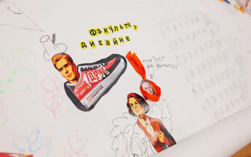 Второй частью занятия стала практика. Студенты разбились на группы и получили задание изготовить коллаж, используя подручные материалы — вырезки из журналов, упаковку от продуктов, краски, маркеры. Работа проходила под руководством руководителя Центра креативных индустрий факультета Светланы Прусаковой.