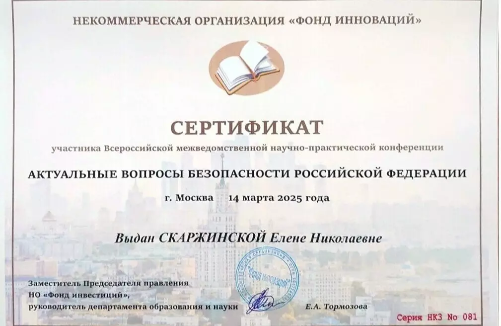 14 марта заведующая кафедрой киберспорта факультета игровой индустрии и киберспорта Университета «Синергия» Елена Скаржинская вместе с представителями некоммерческой организации «Фонд сохранения исторического и культурного наследия, содействия молодежному движению и спорту «Память Эпохи» приняли участие в III Всероссийской межведомственной научно-практической конференции «Актуальные вопросы безопасности Российской Федерации». Мероприятие было организовано некоммерческой организацией «Фонд инноваций» в партнерстве с Федеральным государственным бюджетным образовательным учреждением высшего образования «Государственный университет управления».