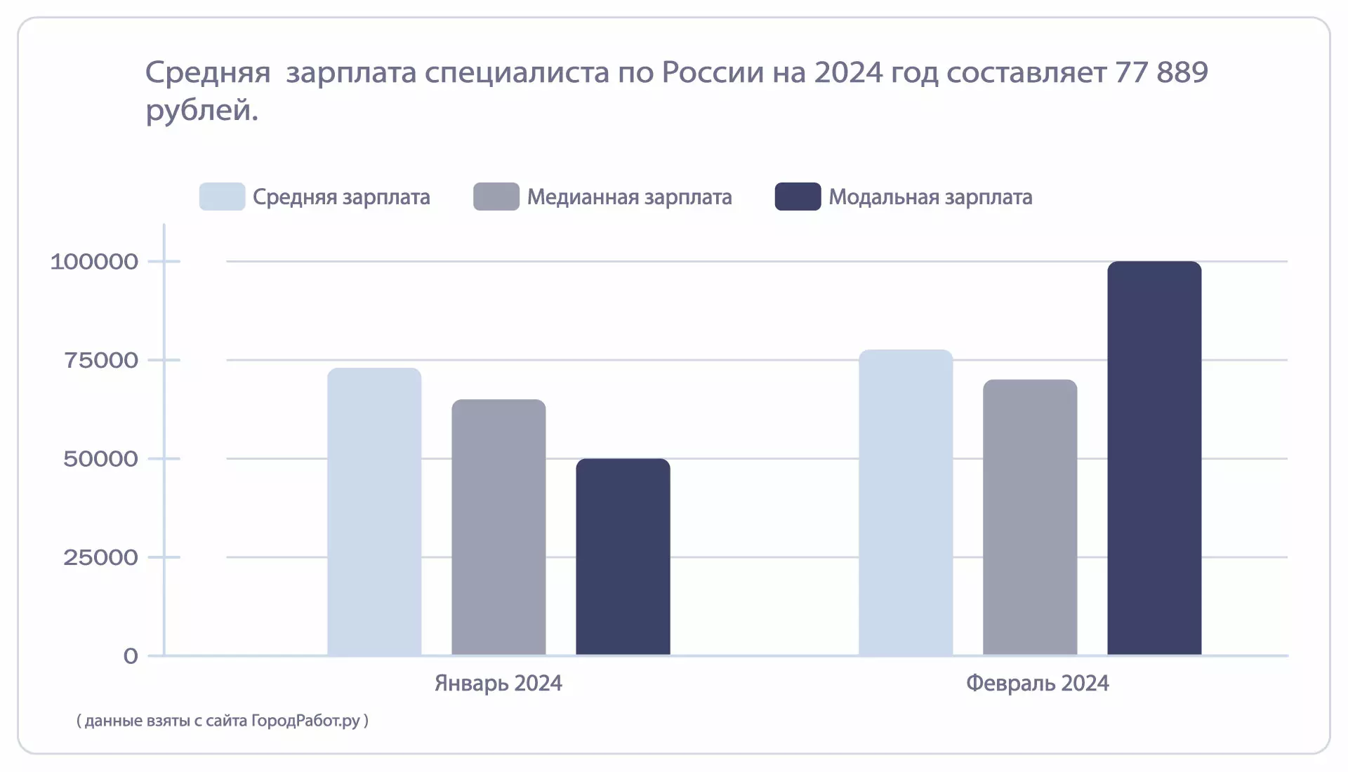 Средняя зарплата специалиста по России на 2024 год составляет 77 889 рублей.