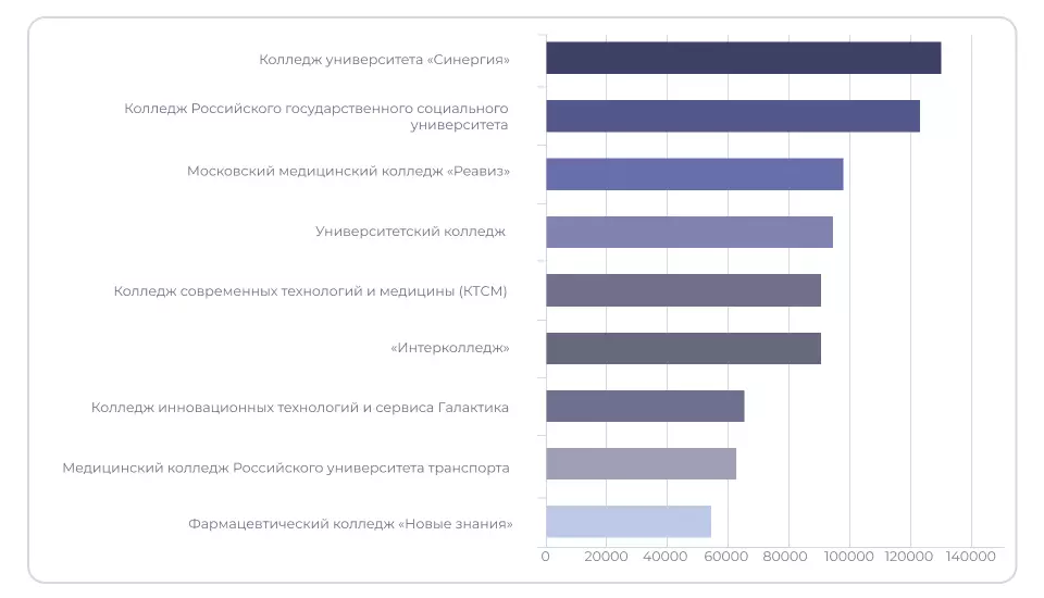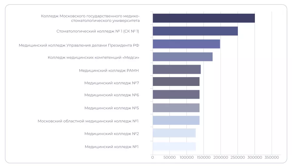Мы собрали информацию по платным образовательным программам в московских медицинских колледжах, и выяснили, какие из них – самые дорогие. На этом графике в верхней строчке стоит Колледж Московского государственного медико-стоматологического университета им. А. И. Евдокимова. Цена года обучения составляет 300 000 рублей; дорого, как в вузе.