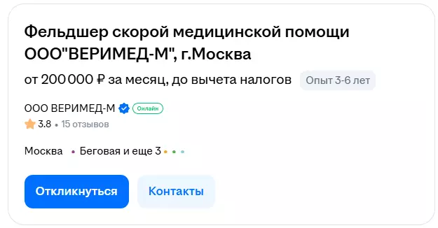 Фельдшеры требуются на скорой помощи, промышленных предприятиях, в медпунктах и лабораториях. Средняя заработная плата по России — 54 421 руб., в Москве — 87 273 руб. Опытные фельдшеры могут претендовать на вакансии с высокой оплатой труда.