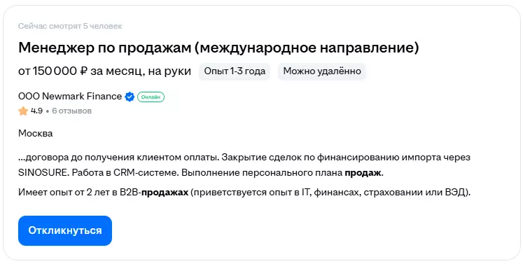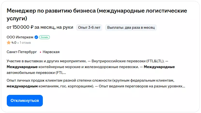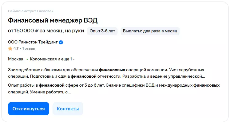 Специалисты работают в экспортно-ориентированных компаниях, международных филиалах, производственных и торговых холдингах, в том числе в FMCG, IT, промышленности и e-commerce. Как правило, доход, указанный в вакансиях, находится в диапазоне от 100 000 до 250 000 рублей с учётом бонусной части.