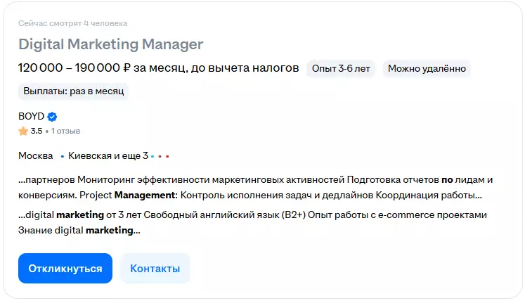 Специалисты трудятся в международных агентствах, IT-сфере и e-commerce. Средний доход — от 110 000 до 650 000 рублей, в крупных компаниях доход может быть выше.