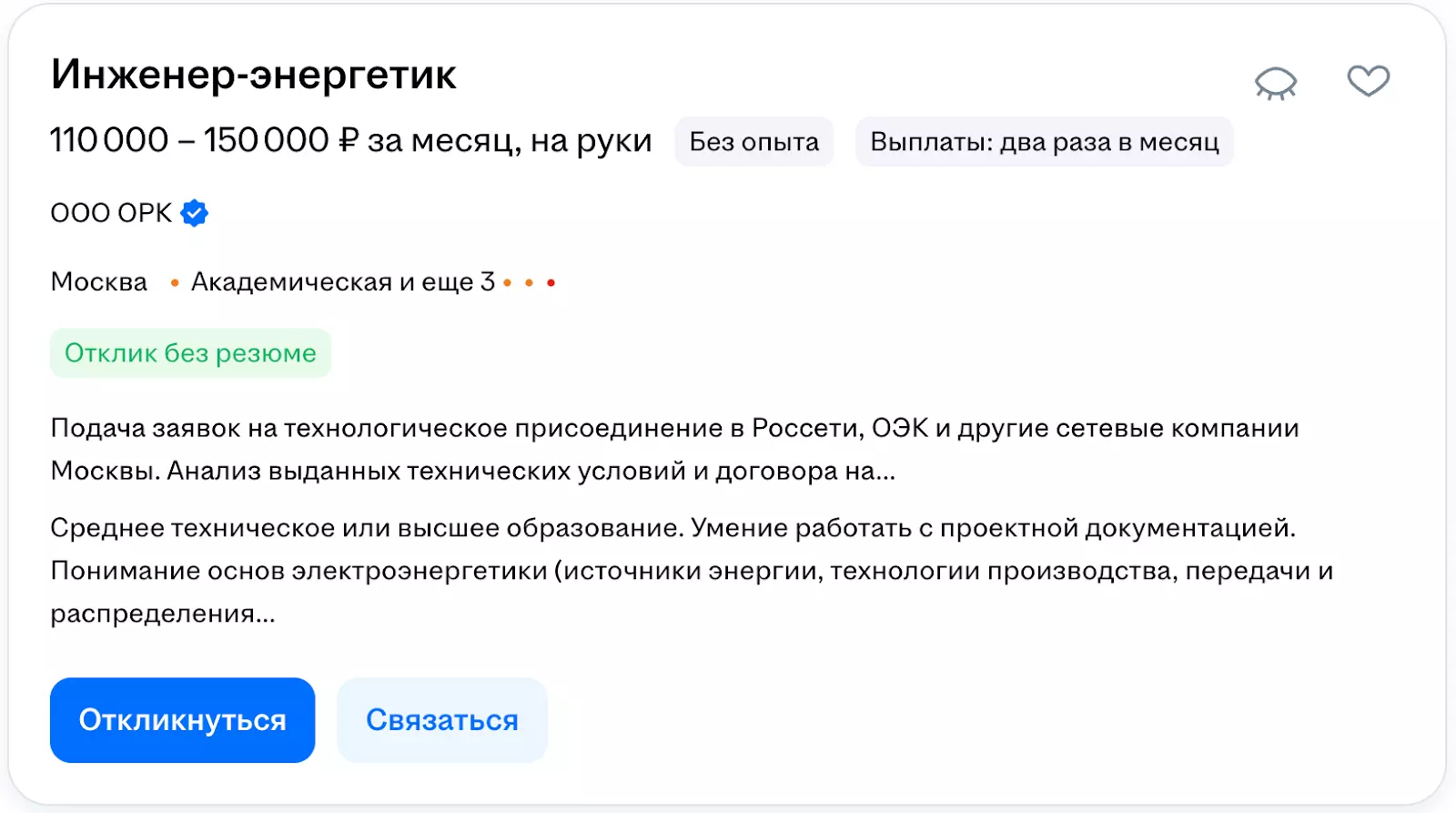 Доход инженеров-энергетиков зависит от места работы, опыта и должности. По данным сайта «ГородРабот.ру», в среднем по стране за 2025 год специалисты зарабатывают 82,1 тыс. рублей в месяц. В Москве инженер-энергетик с опытом от 2 до 5 лет может рассчитывать на зарплату в диапазоне от 85 до 130 тыс. рублей в месяц, ведущий специалист может зарабатывать до 180 тыс. рублей, а зарплата главного энергетика предприятия может достигать 400 тыс. рублей.