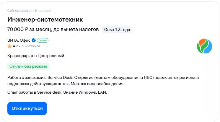 - Высокая стрессоустойчивость. Работа в условиях дедлайнов, при недовольстве заказчика, с «сырым» оборудованием.