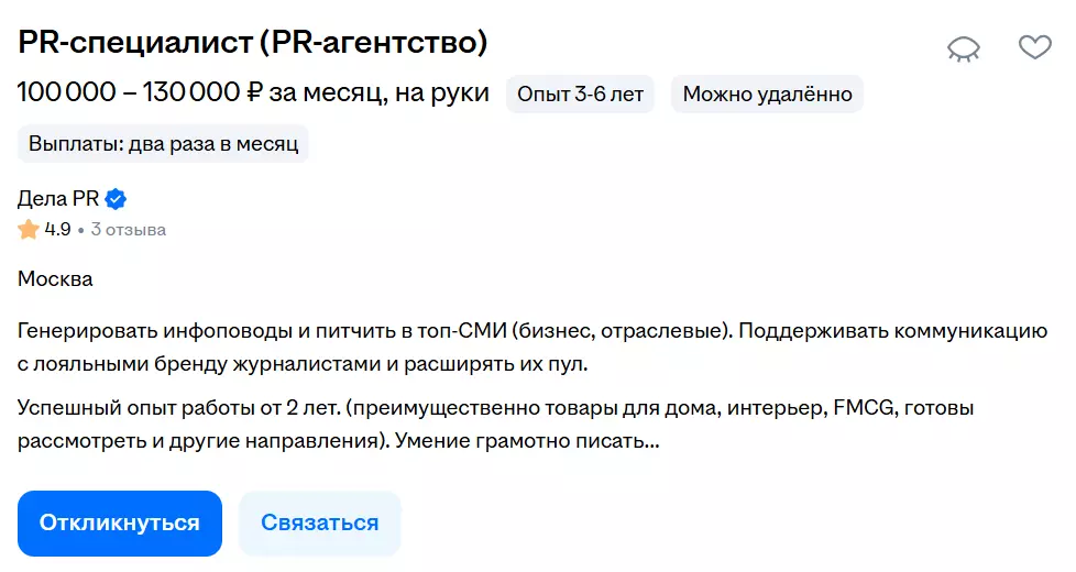 По данным сайта Dream Job, средняя зарплата PR-специалиста в России за 2026 год составляет 93 000 руб. Чаще всего в вакансиях встречаются зарплаты от 60 000 до 121 000 руб.