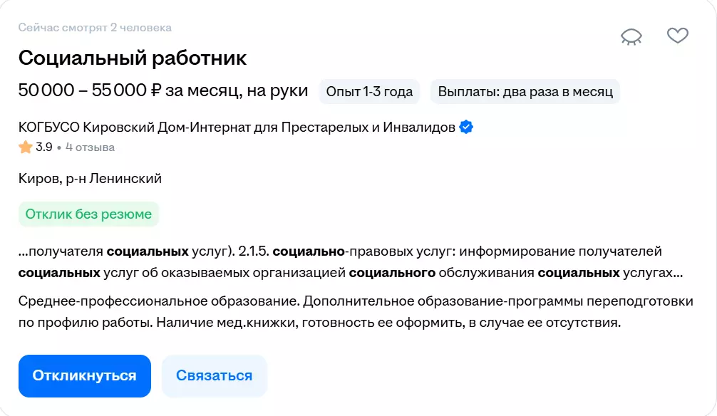 По данным сайта Dream Job, средняя зарплата социального работника в России в 2026 году составляет 55 000 руб. Чаще всего зарплата варьируется в диапазоне от 40 000 до 70 000 руб.