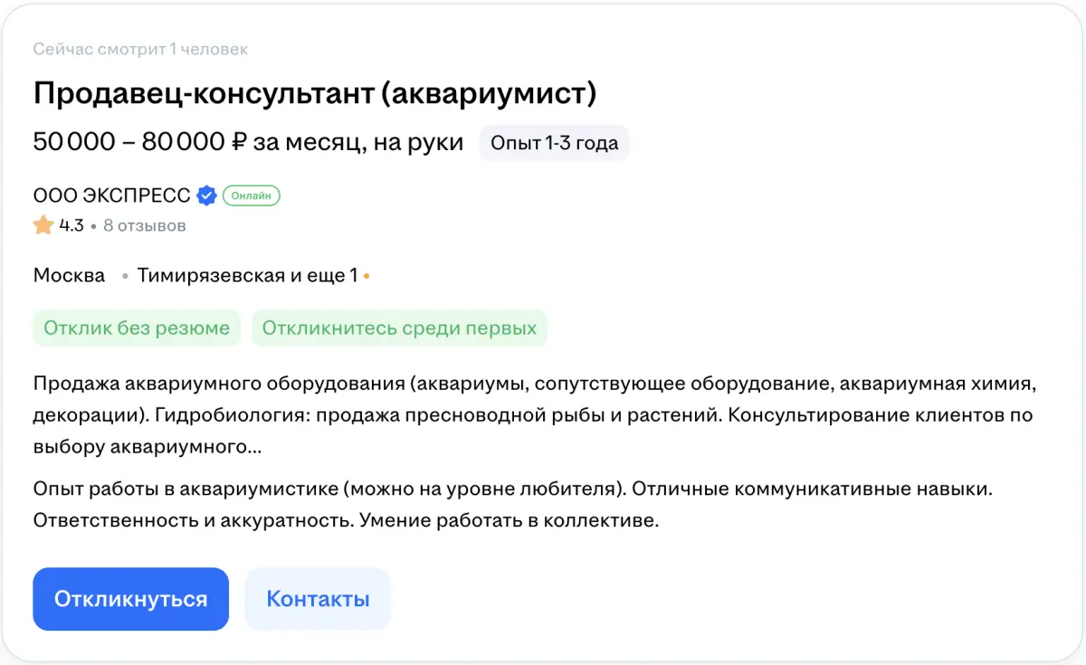 - самостоятельно ведёт 5–10 аквариумов (частных, офисных или экспозиционных);