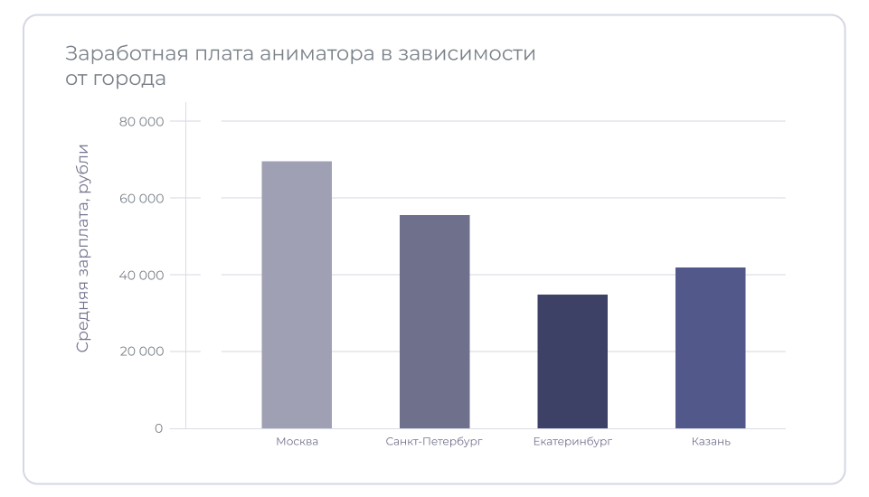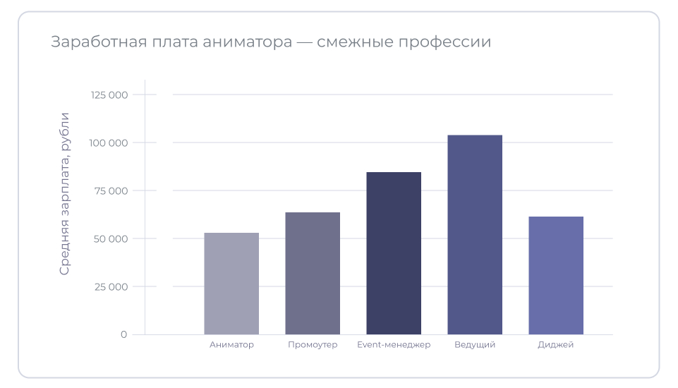 Средняя зарплата аниматора по России сегодня составляет примерно 50 тыс. руб. в месяц. Если аниматор владеет дополнительными навыками — поёт, танцует, выполняет трюки или показывает фокусы, то заработок увеличивается до 70 тыс. руб. Профессионалы, которые работают в премиум-сегменте, создают авторские программы и мастер-классы, могут зарабатывать более 100 тыс. руб.