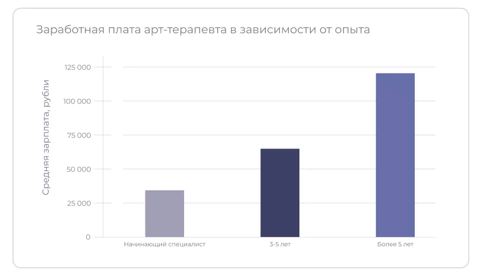 Доходы арт-терапевта зависят от профессионального опыта, уровня квалификации, формата работы и региона трудоустройства. В среднем, зарплаты новичков начинаются от 35 000 рублей. Специалисты, проработавшие несколько лет, могут рассчитывать на зарплату от 65 000 рублей. Заработок арт-терапевта с многолетним стажем и высокой квалификацией превышает 120 000 рублей.
