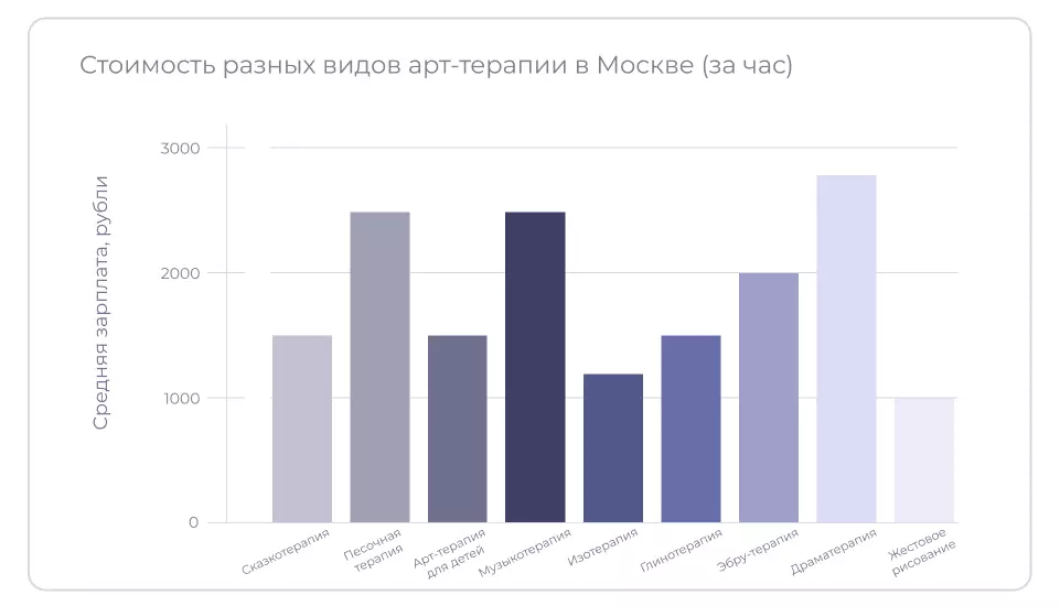 Оформив ИП и оказывая услуги в частном порядке, можно зарабатывать от 1000 до 2800 рублей в час. По данным сайта profi.ru, самые дорогостоящие виды арт-терапии — драма, музыкотерапия, пескография и рисование в технике эбру.