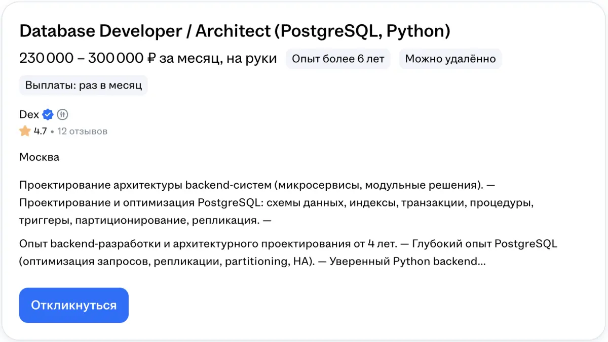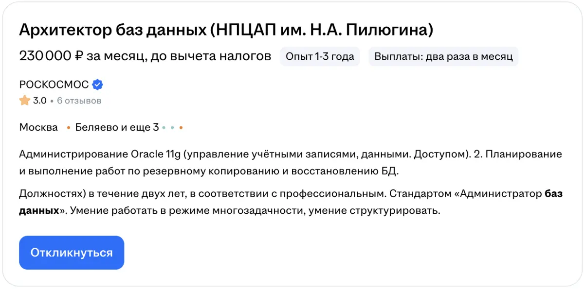 Например, в Москве архитекторам БД с опытом работы 1–3 года готовы платить 230 тыс. руб. в месяц.