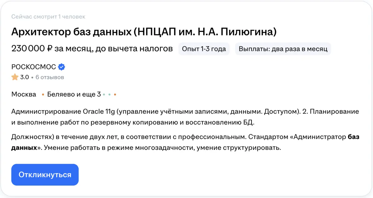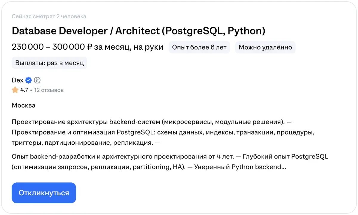 В регионах вакансии архитекторов баз данных встречаются редко. Большинство компаний ищет специалистов уровня разработчиков и инженеров БД, а архитекторы требуются преимущественно в крупных городах. Но многие предложения удалённые: можно работать из любого города.