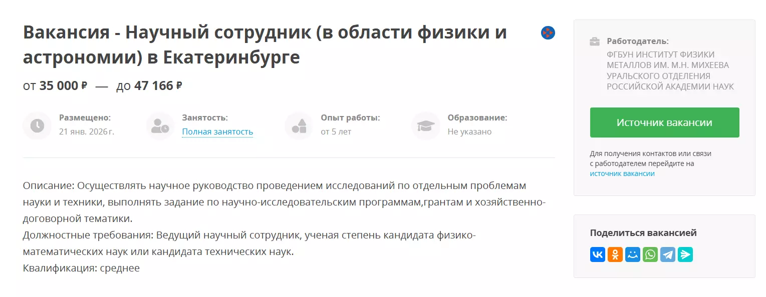 В целом профессия не предполагает большого количества вакансий, однако на квалифицированных специалистов с исследовательским опытом и узкой специализацией спрос остаётся стабильным и прогнозируемым.