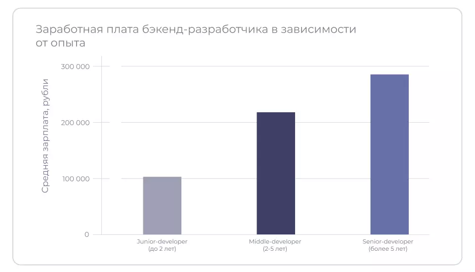 Диапазон зарплат бэкенд-разработчиков варьируется в зависимости от квалификации, опыта и занимаемой должности. Начинающие специалисты (junior) зарабатывают от 73 000 до 137 000 рублей в месяц, разработчики среднего уровня (middle) получают от 160 000 до 285 000 рублей, а доходы старших специалистов (senior) и руководителей могут превышать 283 000 рублей.