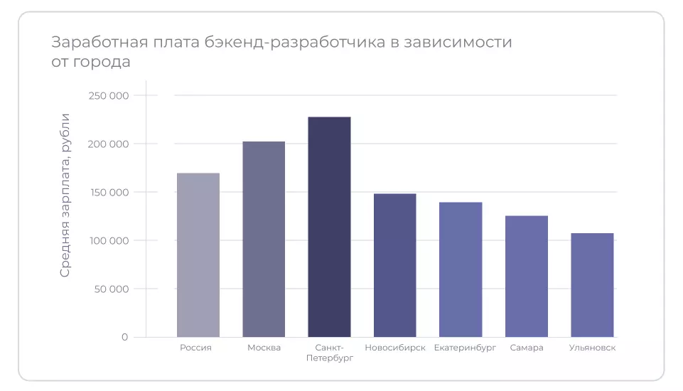 На уровень зарплат бэкенд-разработчиков также влияет специфика региона трудоустройства. Самые высокие заработки в Москве и Санкт-Петербурге — доходы специалистов варьируются от 220 000 до 300 000 рублей. Чем крупнее город, тем больше возможностей найти работу с хорошей зарплатой. Впрочем, многие компании предлагают удалённый тип занятости, что значительно расширяет список доступных вакансий.