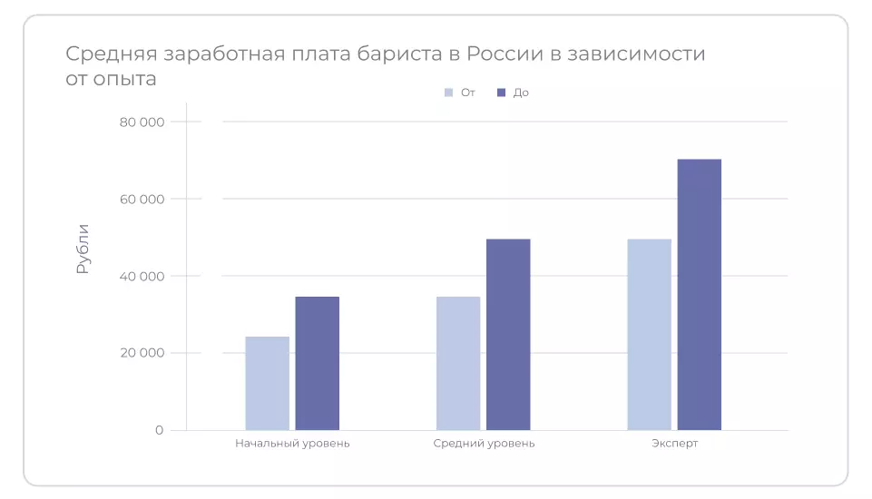 Средняя зарплата бариста по рынку составляет 50 436 рублей, однако на старте доход может начинаться с 27 259 рублей и расти по мере накопления практического опыта и профессиональных навыков.