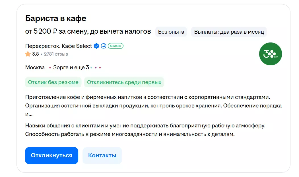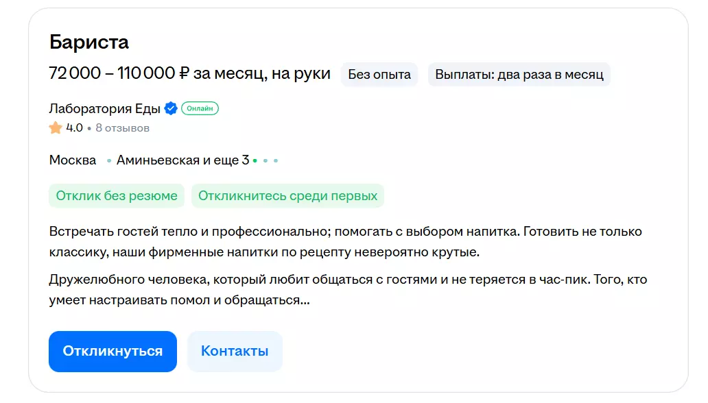 Дополнительно оценить перспективы заработка позволяет анализ актуальных вакансий: он показывает реальные диапазоны зарплат и требования работодателей к бариста разного уровня.
