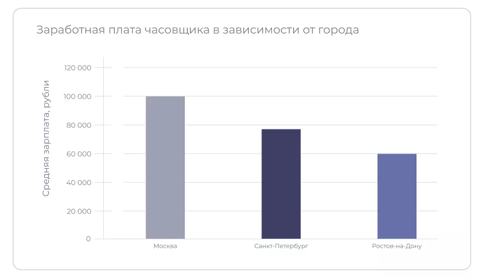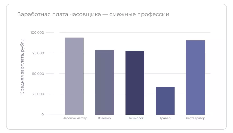 Средняя зарплата часового мастера в России в 2025 году составляет 93 000 рублей. Начальный уровень — от 50 000 рублей, максимальная оплата труда — 180 000 рублей.