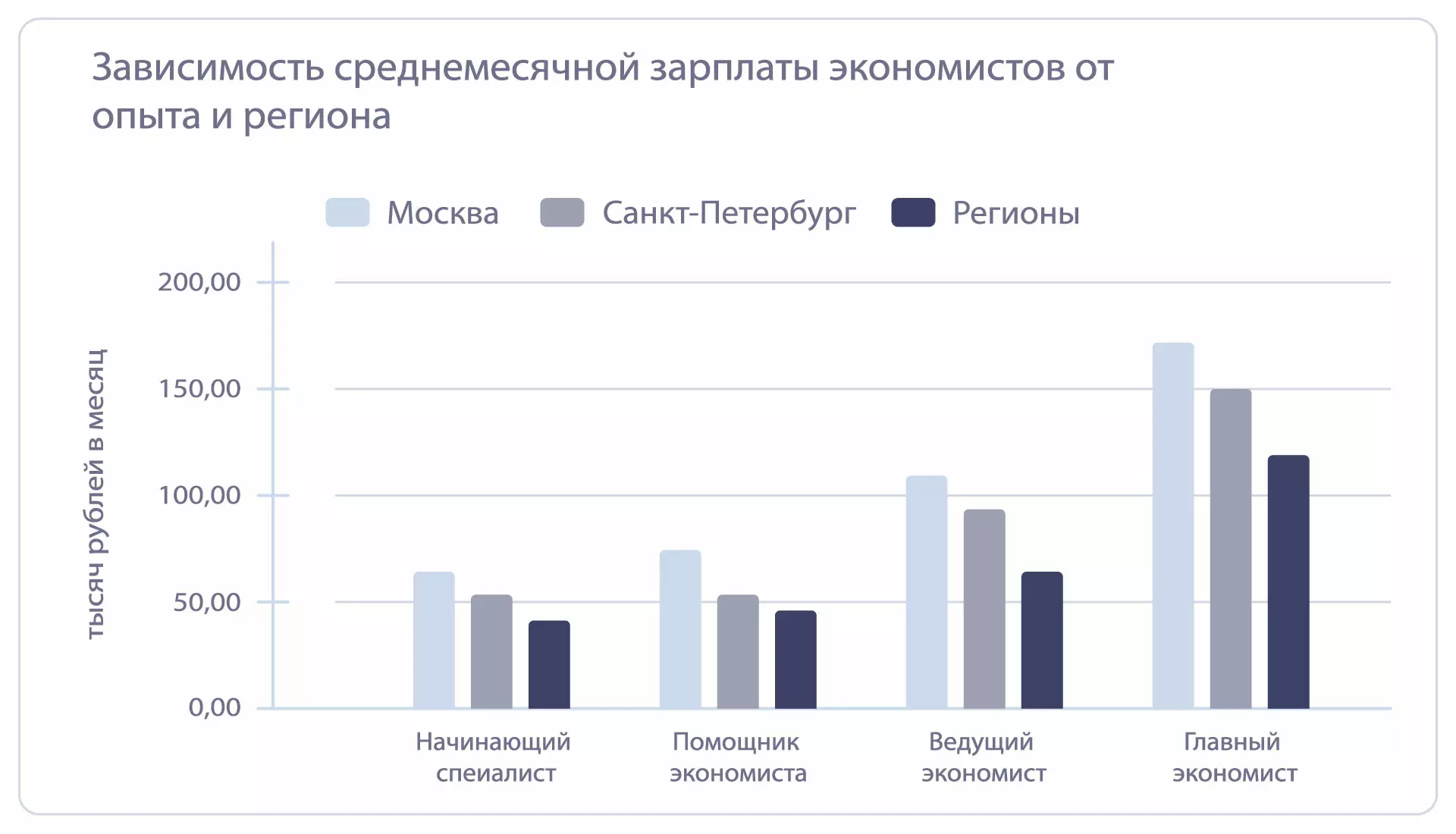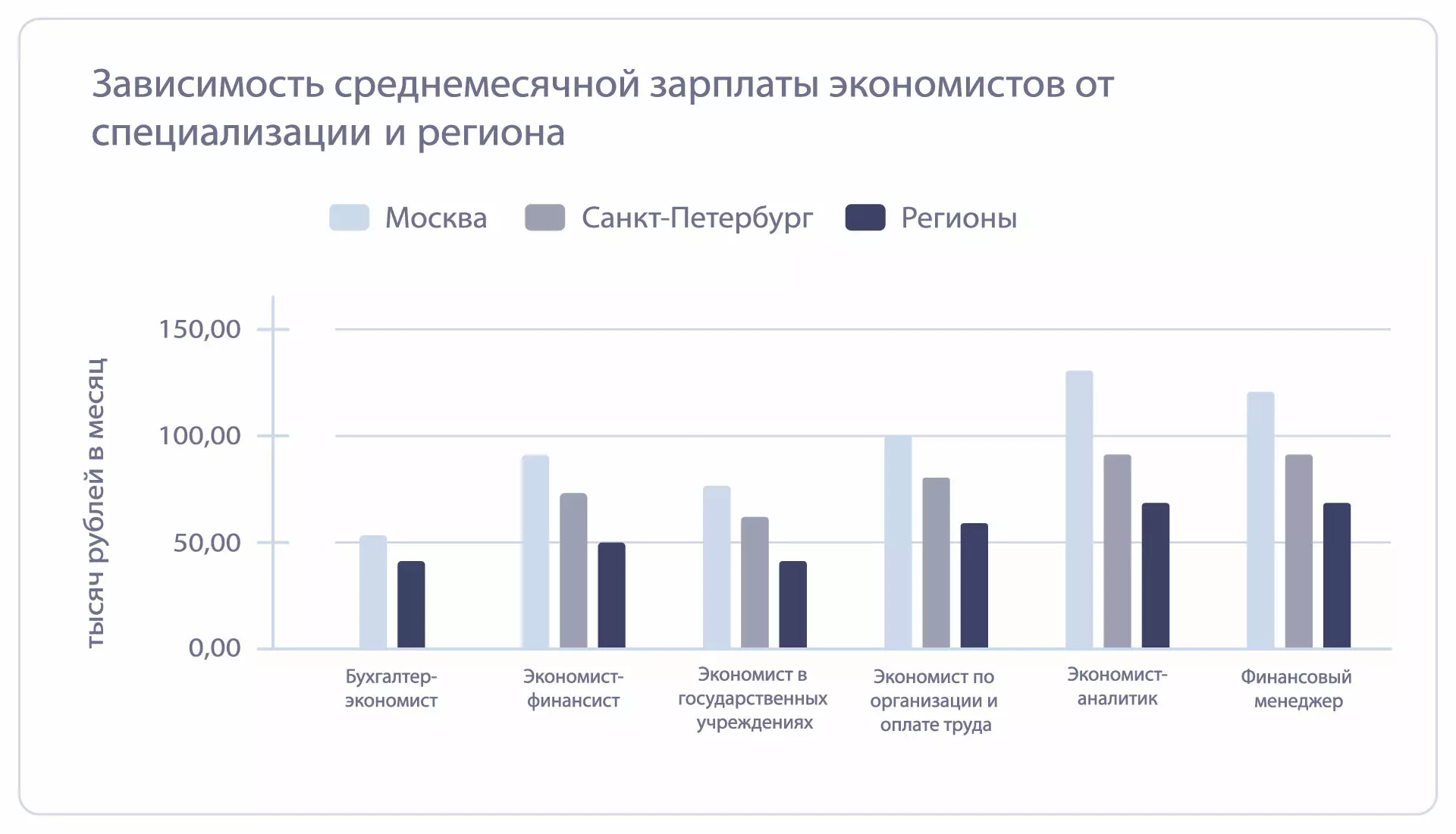 Сколько в среднем зарабатывает экономист, зависит от сферы деятельности, уровня компетенции. Оклад в месяц колеблется от 25 000 до 250 000 рублей. Он также варьируется в зависимости от региона, отличается в Москве и остальной России. Согласно порталу ГородРабот.ру, в среднем экономисту в регионах платят 50 000 рублей. По данным сайта Superjob.ru, в столице этот показатель составляет 80 000.