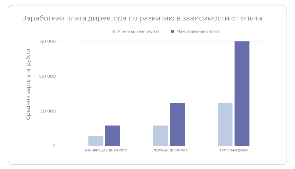 Уровень дохода директора по развитию бизнеса варьируется в зависимости от опыта, масштаба компании и региона. Чем больше ответственность и зона влияния, тем выше зарплата — в топовых компаниях она может превышать 1 000 000 руб. в месяц.
