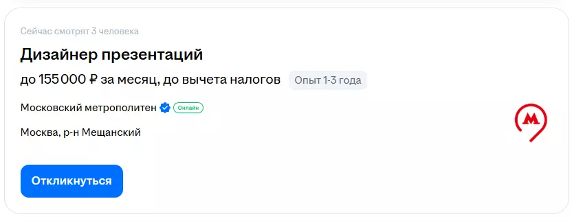 В июле 2025 года на сервисе поиска работы hh.ru можно найти 92 вакансии по запросу «дизайнер презентаций». Начинающему специалисту с опытом до трёх лет предлагают зарплату от 45 до 155 тыс. рублей. В задачах обычно указывают: