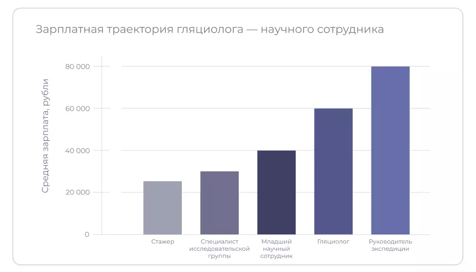 Зарплата гляциолога зависит от места работы, командировок, активности участия в проектах и научных исследованиях — средний уровень варьируется в диапазоне от 80 000 до 120 000 рублей.