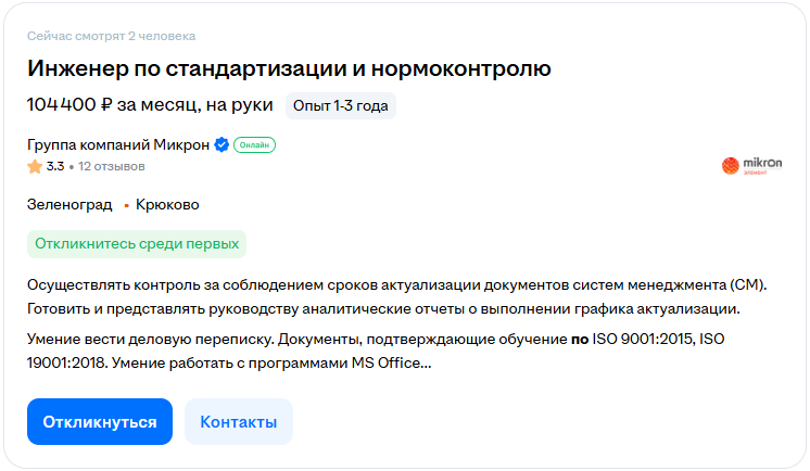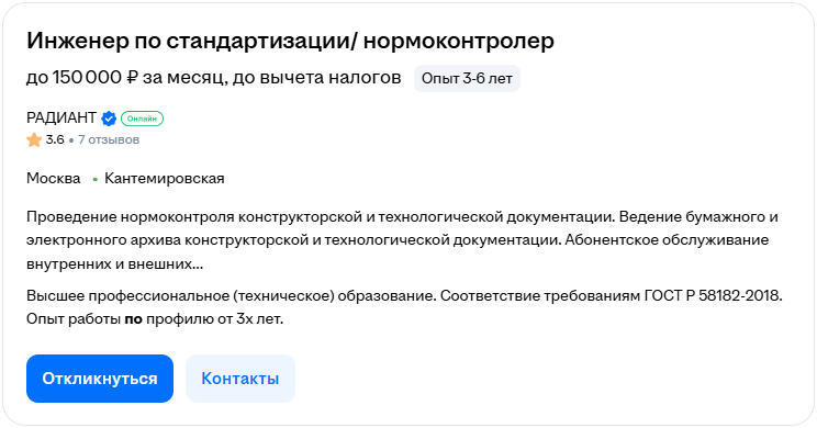 На hh. ru и других агрегаторах вакансий встречаются предложения с более высокими зарплатами. Например, в Москве инженер по стандартизации с опытом 1–3 года может ежемесячно зарабатывать около 100 000 руб., а его коллега с опытом 3–6 лет — от 150 000 в месяц.
