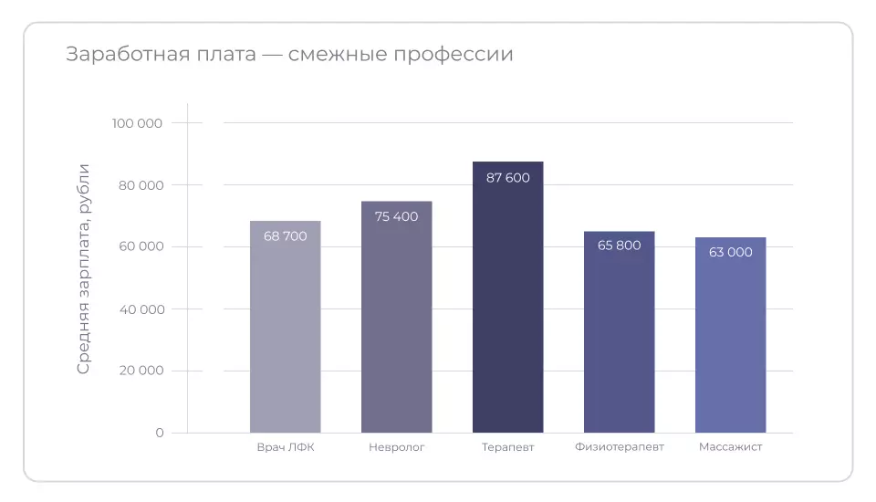 По данным сервиса JobFilter.ru средняя зарплата врача ЛФК в 2025 году составляет 68 700 руб. По регионам статистика такая: