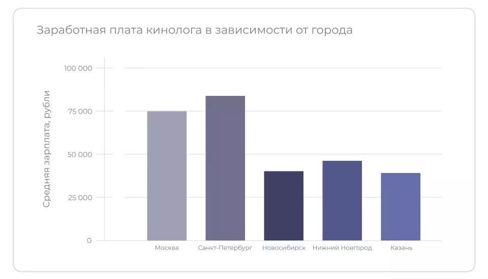 По данным сайта РБК, средняя зарплата кинолога в России в 2025 году составляет 49 686 рублей. Рассмотрим статистику зарплат по разным городам: