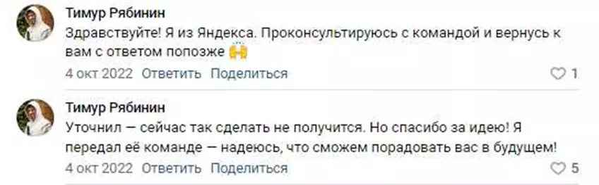Ответ представителя «Яндекса» на вопрос пользователя. Источник: сайт во «Вконтакте»
