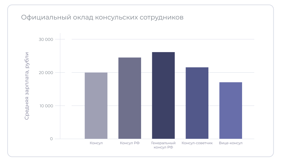 Зарплата консульских работников складывается из фиксированного оклада и разных видов надбавок: за стаж, допуск к государственной тайне, дипломатический ранг, а также уровень консульского учреждения, в котором работает специалист. Согласно Приложению к Указу Президента РФ от 23.06.2014 с изменениями от 2023 года, фиксированный размер оклада консула составляет 20 тыс. руб.