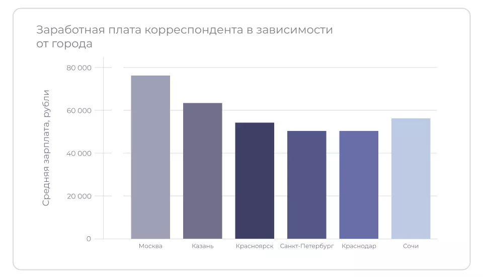 Зарплата корреспондента зависит от опыта, специальности и бюджета работодателя. В локальных СМИ она связана также с регионом работы. Но профессия позволяет трудиться удалённо — чтобы больше получать, можно сотрудничать с иногородними, федеральными и международными СМИ. Рассмотрим статистику зарплат в крупных городах-миллионниках, таких как Москва, Санкт-Петербург, Новосибирск и прочие.