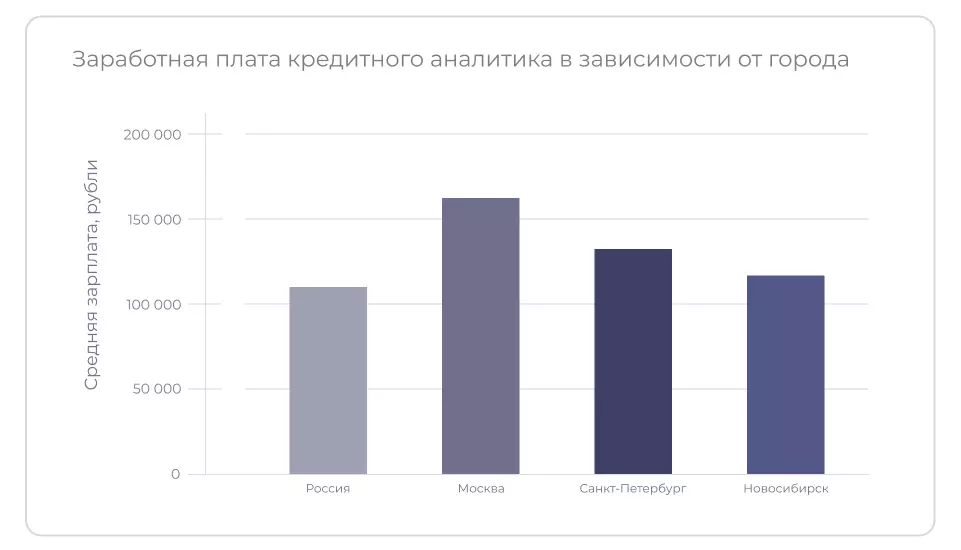 По данным сайта ГородРабот.ру, средняя зарплата кредитного аналитика в России за 2025 год — 119 991 рубль. Чаще всего в вакансиях встречается зарплата 100 000 рублей.
