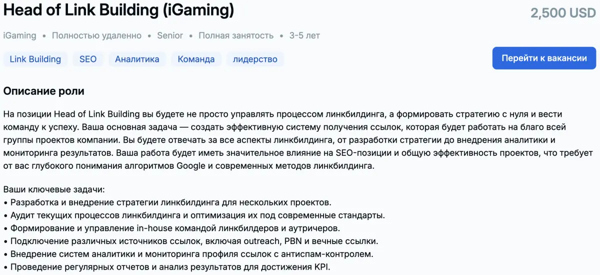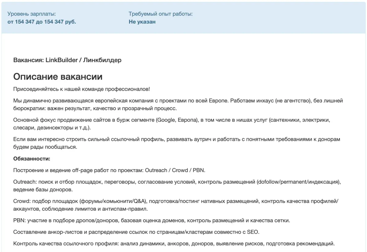 Примеры вакансий для линкбилдеров разных уровней, опубликованных в Рунете:
