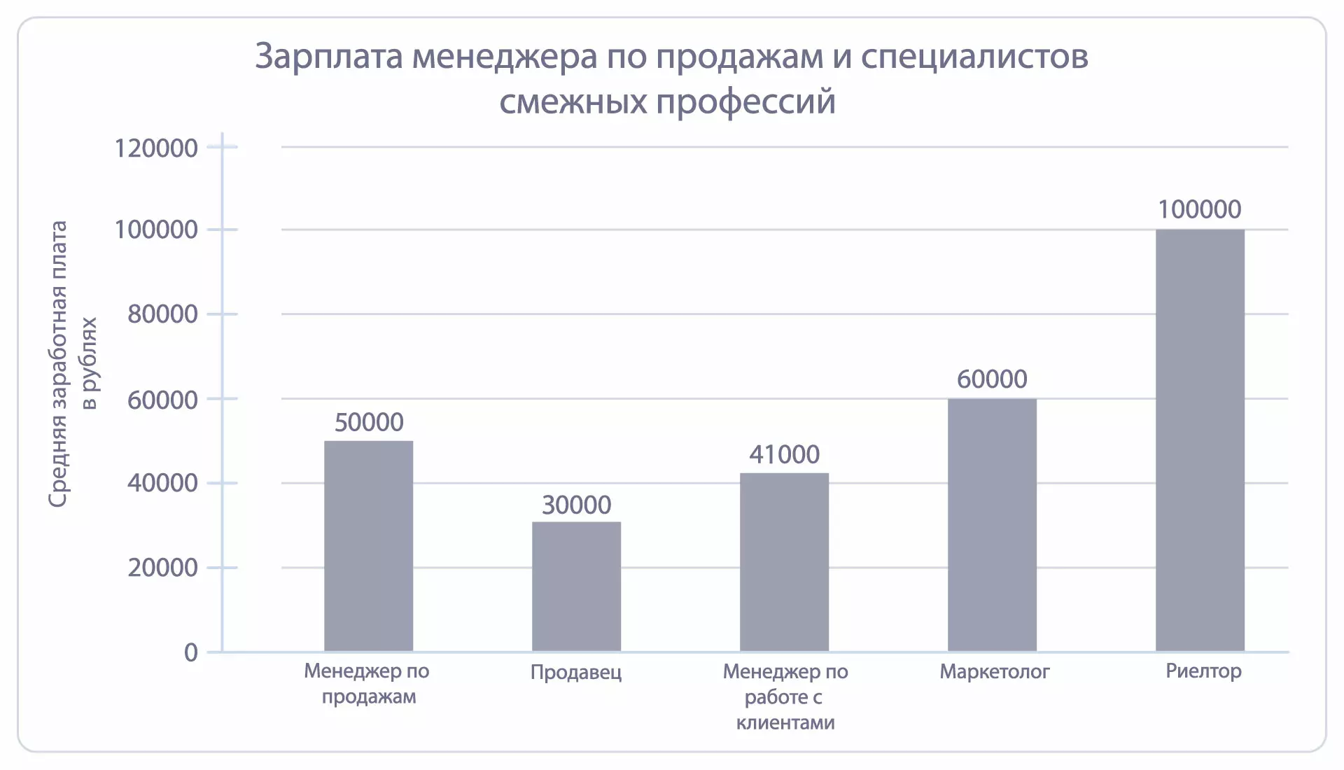 А теперь сравним среднюю заработную плату менеджера по продажам и специалистов других профессий: продавца, менеджера по работе с клиентами, маркетолога и риелтора: