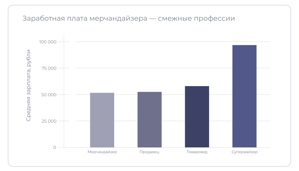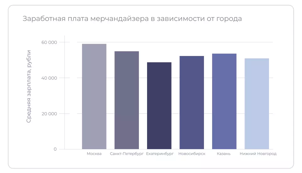 Зарплата зависит от опыта работы специалиста, ассортимента и размера магазина. В торговых сетях зарплаты часто выше, чем в одиночных магазинах. В супермаркетах и гипермаркетах более высокие зарплаты, что связано с увеличенной нагрузкой на мерчандайзеров. Средние зарплаты в Москве и Санкт-Петербурге выше, чем в других регионах России.
