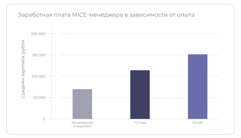 Зарплата MICE-менеджера зависит от его квалификации, трудового стажа, занимаемой должности и профессиональной репутации. Молодые специалисты, проработавшие менее года, получают около 70 тыс. руб. Менеджеры с опытом работы 1–3 года в среднем зарабатывают 114 тыс. руб., а ежемесячные заработки специалистов со стажем 3–6 лет могут превышать 150 тыс. руб.