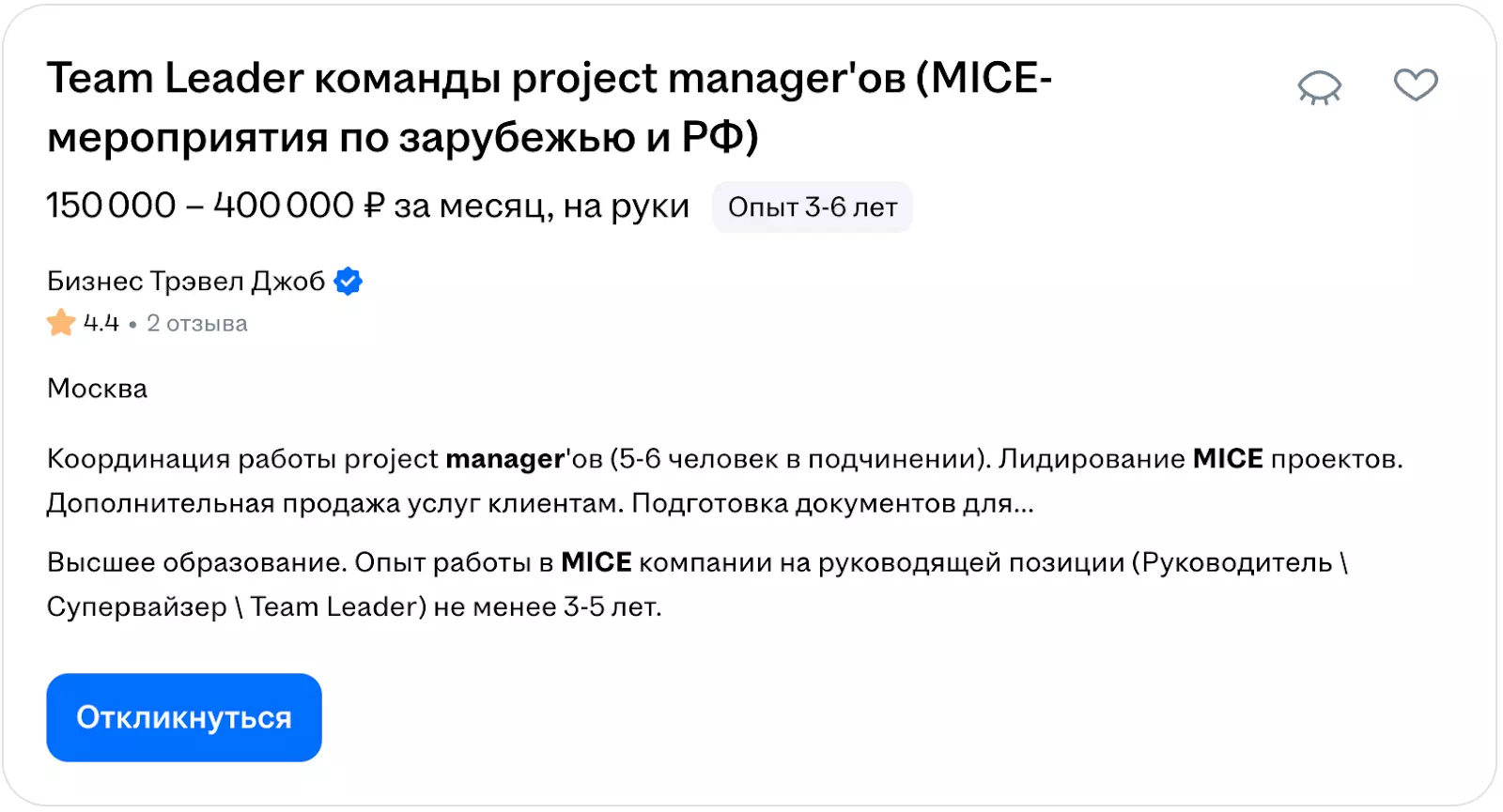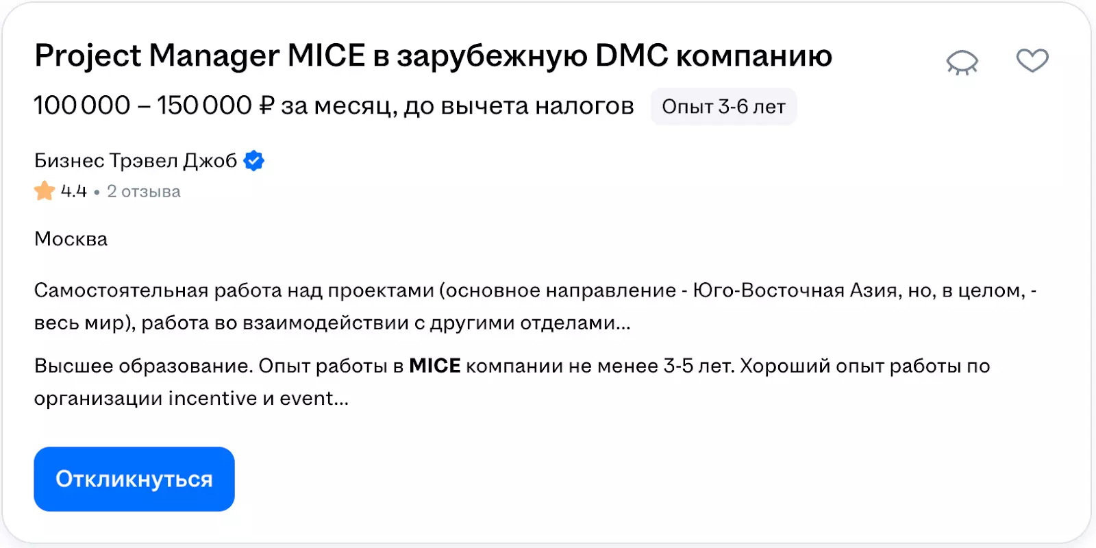 На управляющих должностях доходы значительно выше: агрегаторы вакансий предлагают варианты трудоустройства с зарплатами от 100 до 400 тыс. руб. В основном вакансии в сфере MICE предполагают работу в Москве: на столицу приходится 87% предложений. Дело в том, что там сосредоточена большая часть крупных компаний, которые могут позволить себе масштабные корпоративные мероприятия и дорогостоящие бизнес-поездки.
