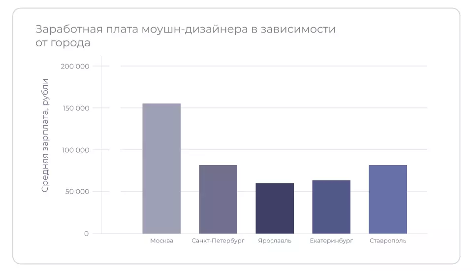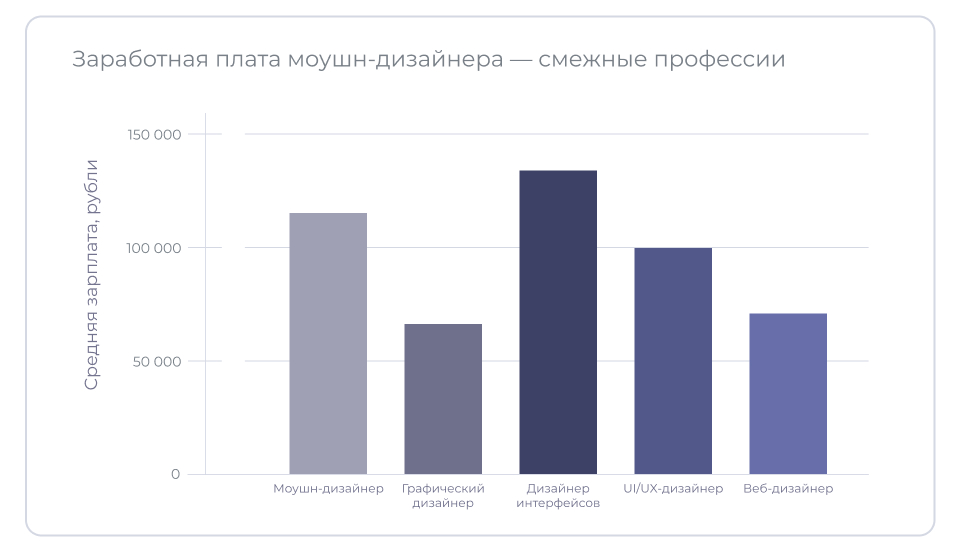 По данным сервиса DreamJob, средняя зарплата моушн-дизайнера в России за 2025 год — 115 тыс. рублей. Средний диапазон — от 80 до 150 тыс. рублей. Минимальная зарплата — 60 тыс. рублей.