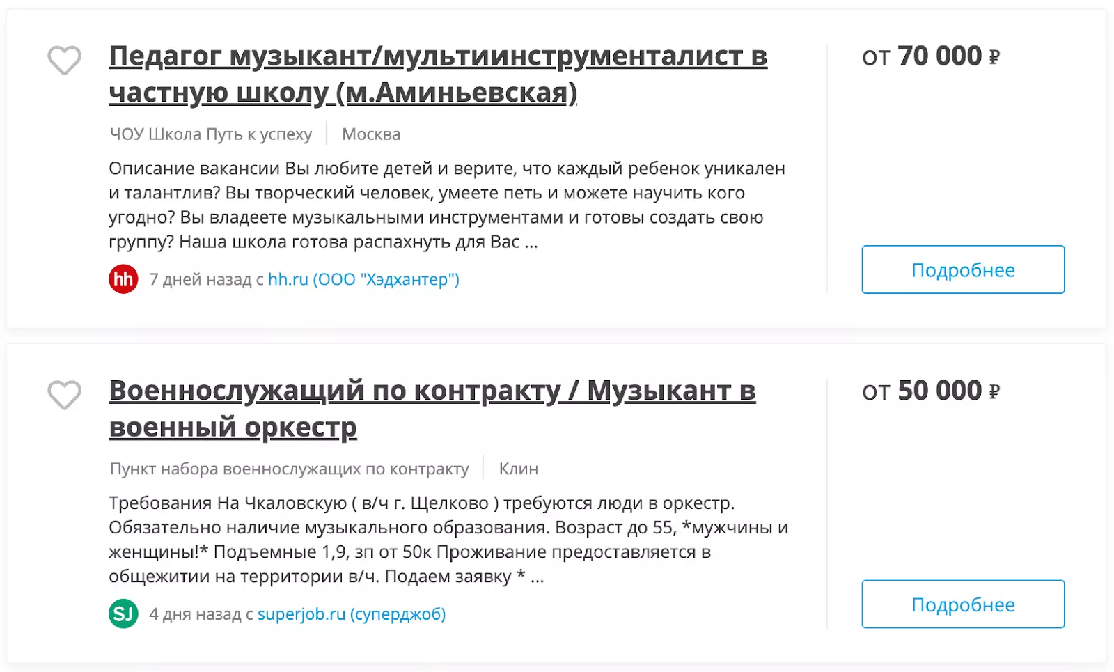 Можно начать работать преподавателем в музыкальной школе или давать частные уроки; стать артистом симфонического или оперного оркестра, ансамблистом камерного коллектива. Если ваша специальность — звукорежиссура, то можно поискать работу в звукозаписывающей студии.