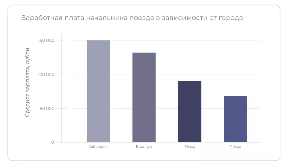 По данным сайта Dreamjob.ru, средняя зарплата начальника поезда в России за 2025 год — 100 000 рублей. Чаще всего зарплаты находятся в диапазоне от 70 000 до 130 000 рублей, а максимальная зафиксированная — 150 000 рублей.