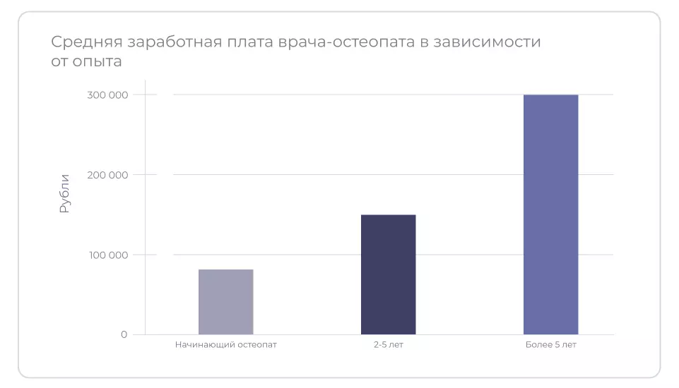 Доходы остеопата зависят от опыта работы, региона трудоустройства, специфики медучреждения и типа его финансирования. Молодые специалисты в крупных городах могут рассчитывать на зарплату от 60 до 100 тыс. руб. в месяц. Остеопаты с трудовым стажем от 2 до 5 лет в среднем ежемесячно получают 100–200 тыс. руб. У их опытных коллег, работающих в сфере медицины более 5 лет, доходы варьируются от 200 до 400 тыс. руб. в месяц.